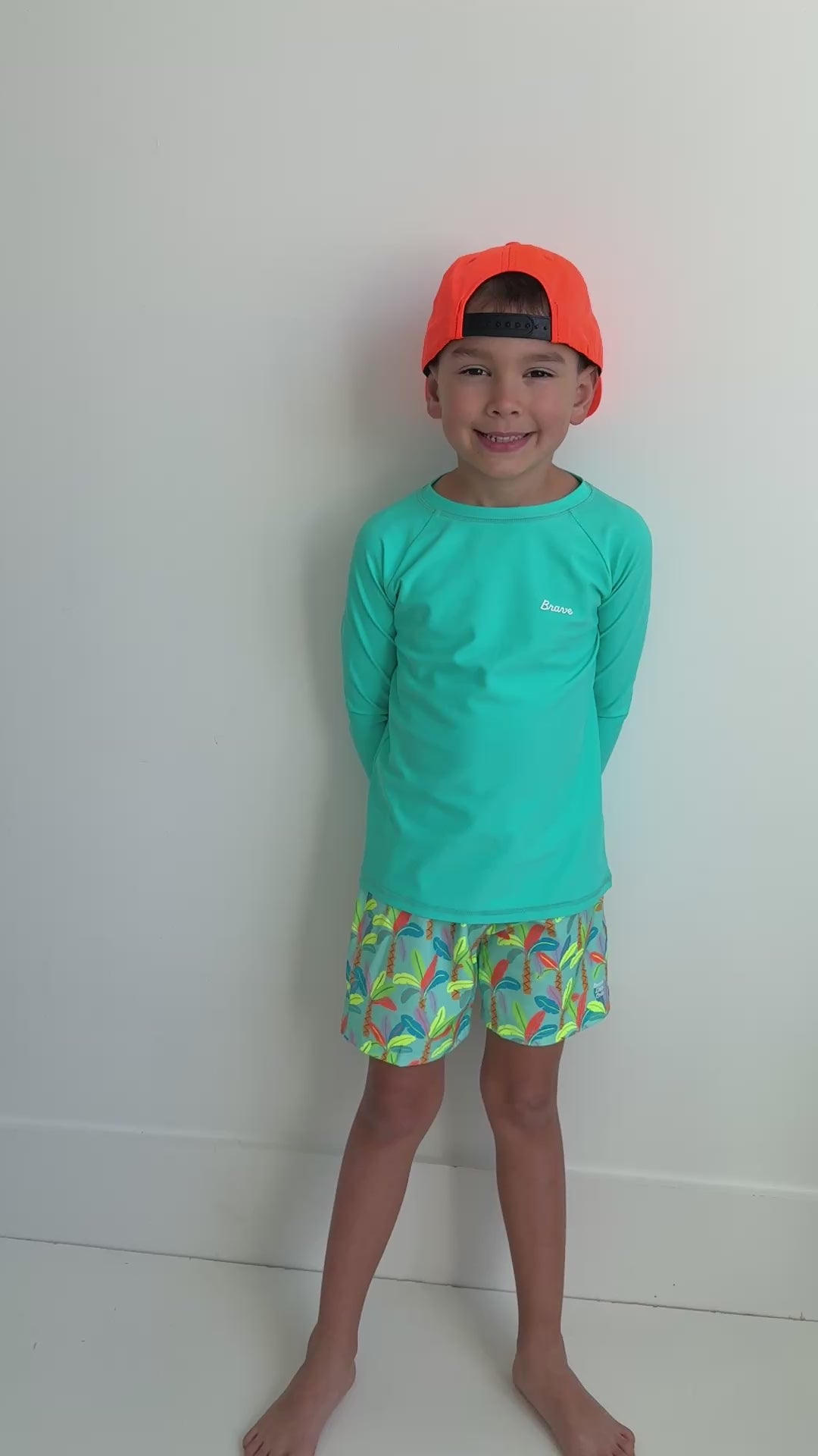 Rachel P. This is such a perfect fit! We love the neon color for safety and the "brave" in the corner. My son absolutely loves wearing this rash guard!